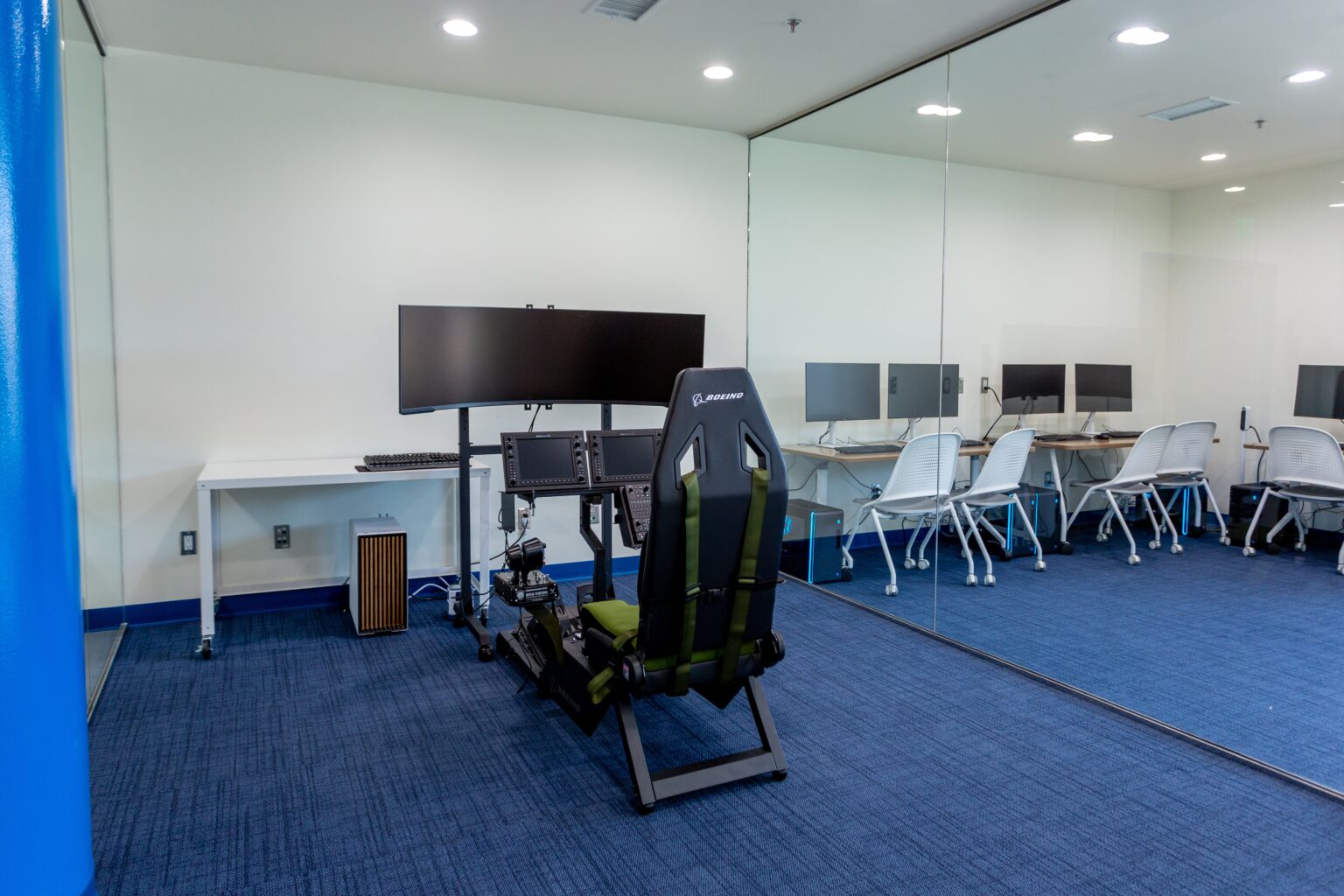 A custom flight simulator featuring a Boeing Military Edition chair provides an immersive experience for aviation training and simulation.