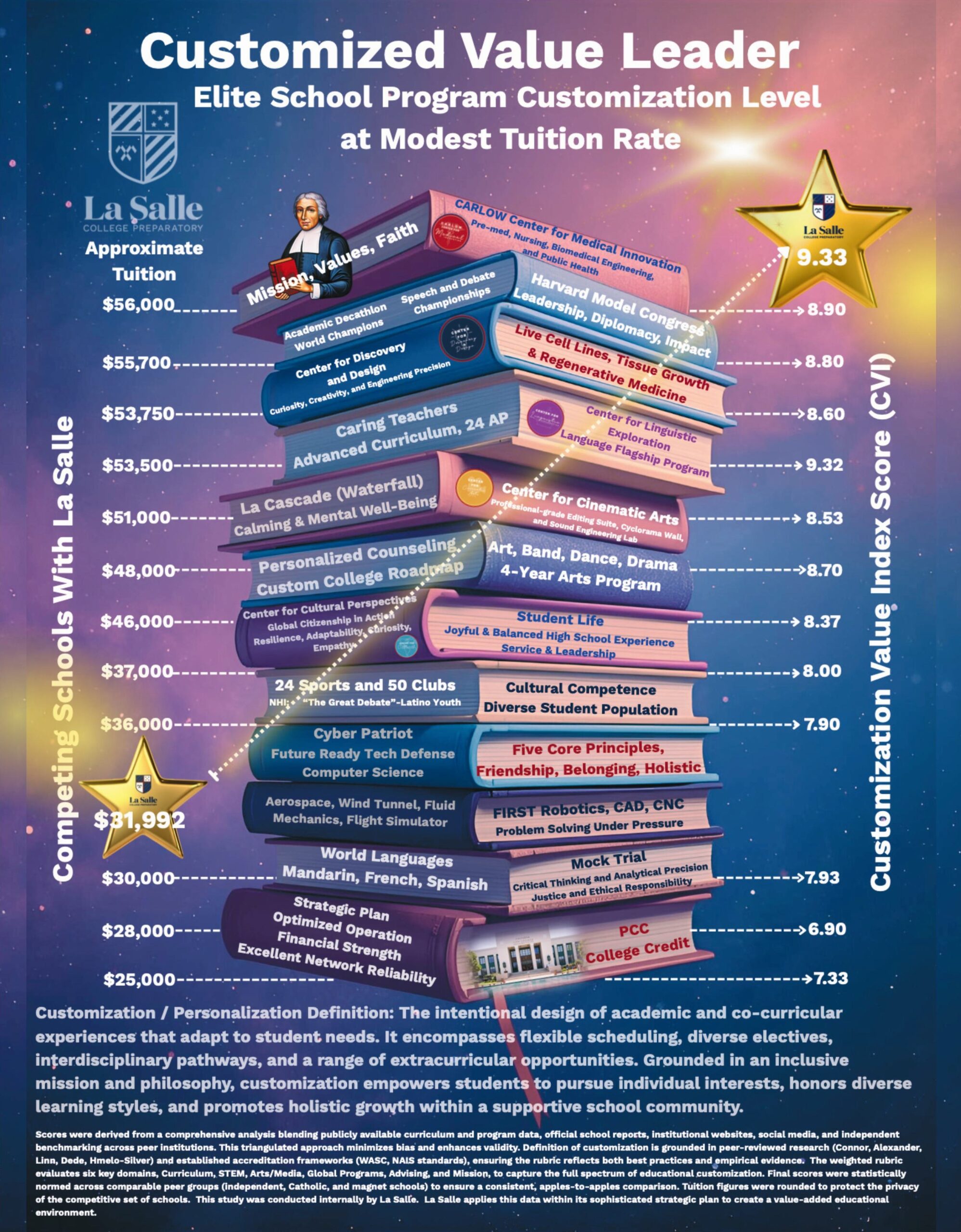 The Customization Value Index (CVI) is La Salle College Preparatory’s data-driven measure of educational value. It compares the level of academic customization and innovation that students experience against the tuition that families invest. In simple terms, it answers the question every parent asks: “How much personalized, high-quality education does my child receive for every tuition dollar?”